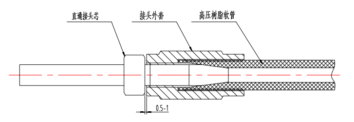 2) 把直通接頭芯從接頭外套的另一端順時(shí)針旋入,二者之間留有 1mm 左右間隔,如圖所示。為便于安裝,可在接頭芯前段表面沾一點(diǎn)油或脂。
