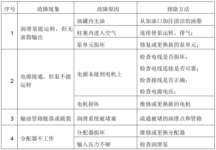 7.若設(shè)備長(zhǎng)期不用,請(qǐng)將系統(tǒng)中的油脂清除干凈,避免因油脂變質(zhì)而影響系統(tǒng)正常工作。 注意:在使用和維護(hù)保養(yǎng)中,要確保無(wú)任何雜物混入潤(rùn)滑系統(tǒng)。否則,將會(huì)造成系統(tǒng)的故障和元器件的損壞。因使用不清潔的潤(rùn)滑油造成的設(shè)備損壞,不在產(chǎn)品保修范圍內(nèi)。